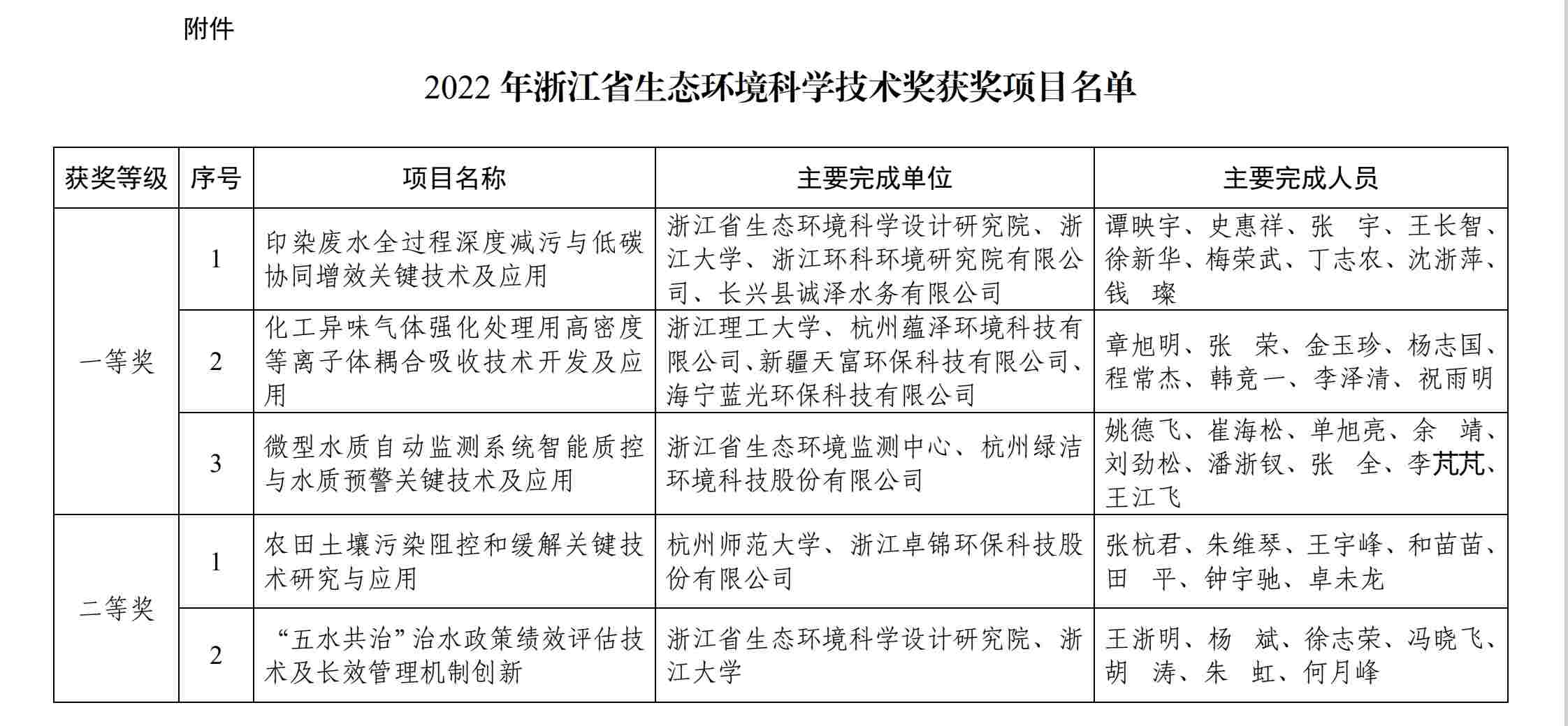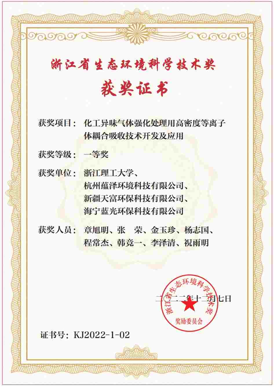 2022年12月7日,根據浙江省環境科學學會《關于開展2022年浙江省生態環境科學技術獎申報工作的通知》和《浙江省 生態環境科學技術獎勵辦法(試行)》的通知,經學會專家組形式審查、線上專家初審、現場終審答辯、網上公示,杭州蘊澤環境科技有限公司聯合浙江理工大學等單位共同研發的“化工異味氣體強化處理用高密度等離子體耦合吸收技術” 獲得了浙江省環境科學學會專家組的高度評價與認可,榮獲浙江省生態環境科學技術獎一等獎。這是學會對我司技術創新、推廣應用工作的鼓勵、支持與信任。